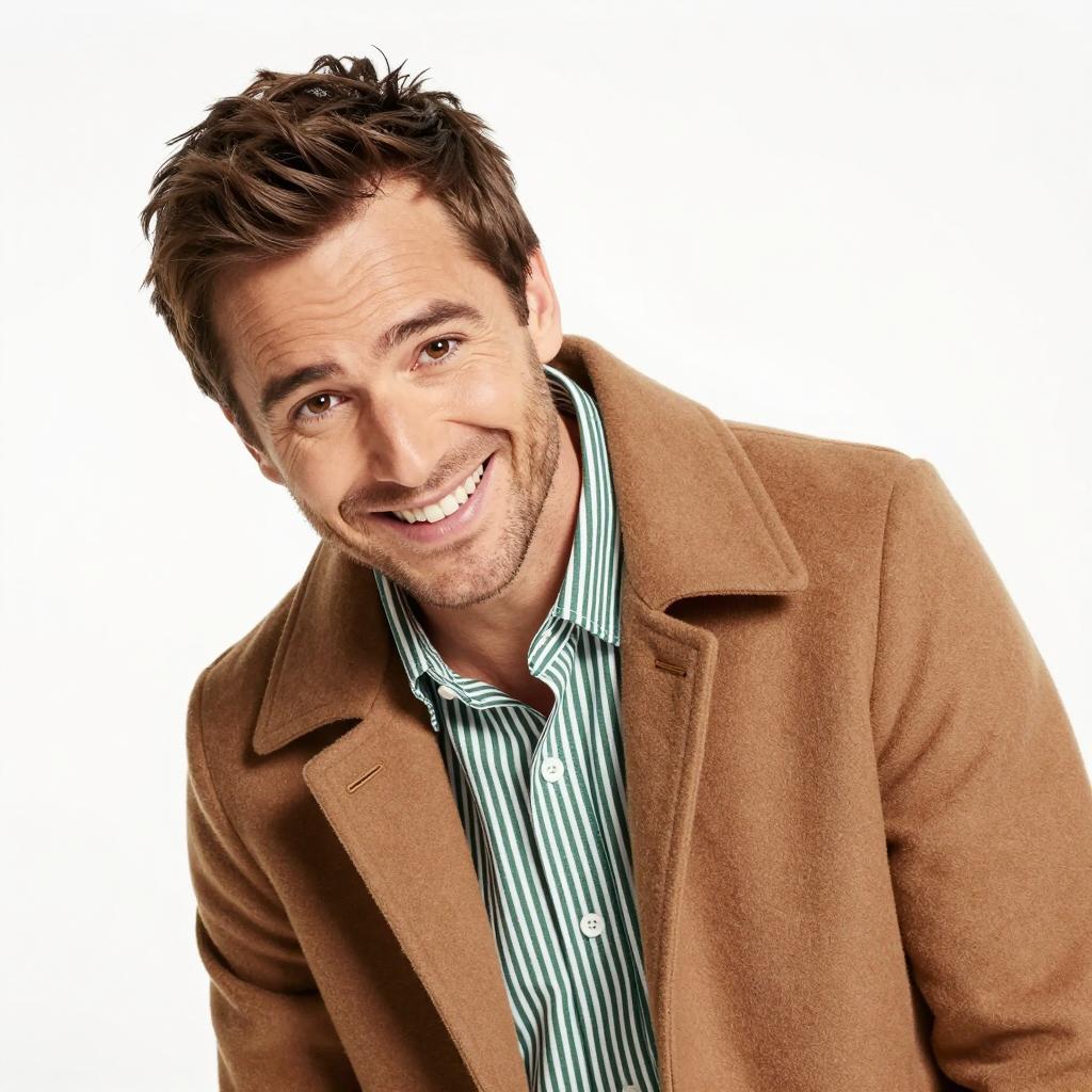Photograph of a man with short dark hair, wearing a brown tweed jacket, light blue shirt, and dark pants. He stands against a bright red curtain with a circular red light behind his head. He has a neutral expression, and his hands are by his sides. The curtain is vertically pleated, and the background is plain.