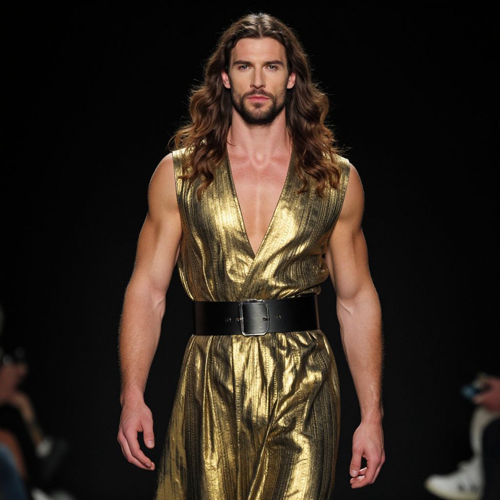 Photograph of a tall, muscular man with long, wavy brown hair and a beard, walking down a runway. He's wearing a sleeveless, shiny gold V-neck dress with a black belt, highlighting his toned arms. His serious expression contrasts with the elegant, futuristic outfit. The background is a solid black, focusing all attention on him and his striking appearance.