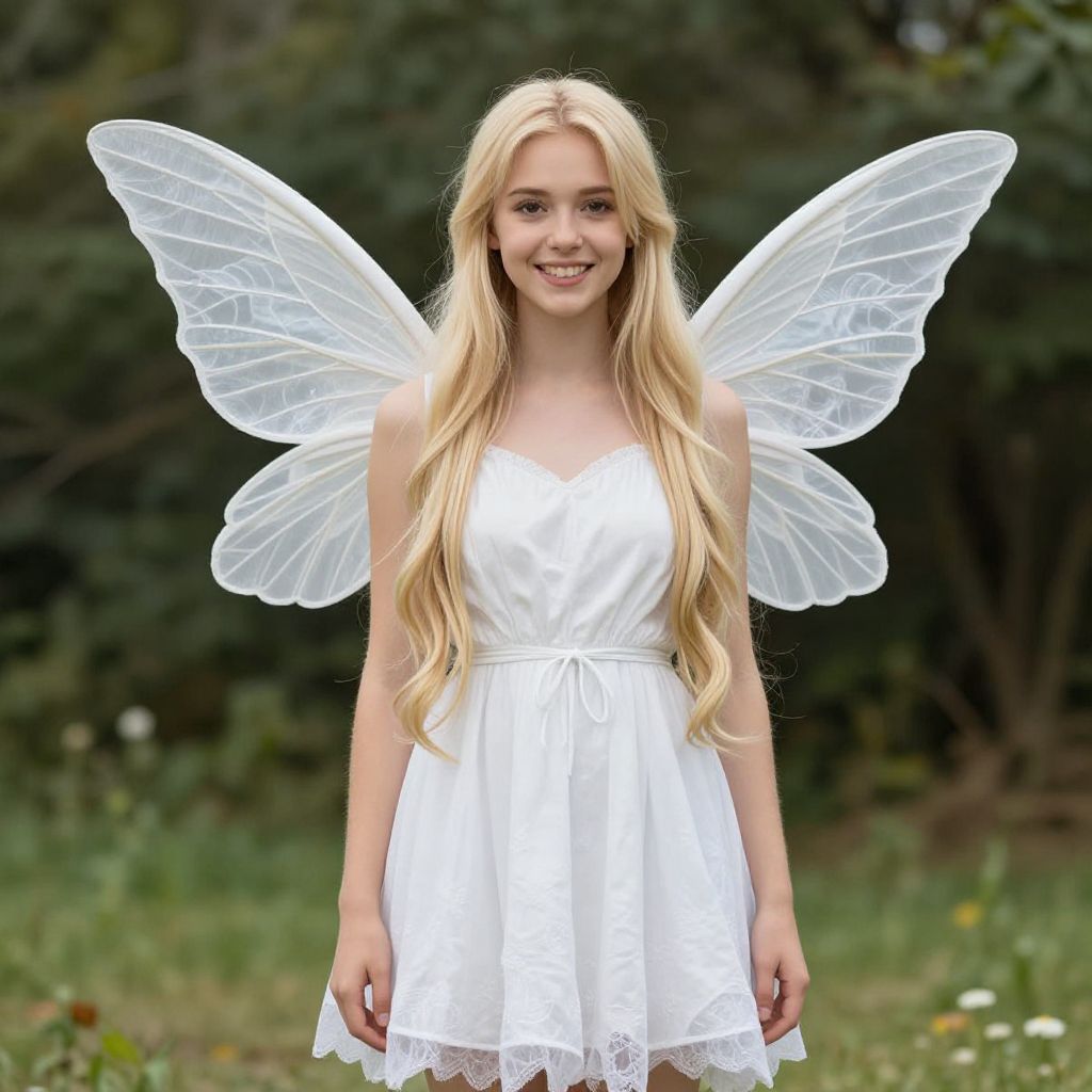 Photograph of a smiling young blonde girl with long hair, wearing a white dress and translucent fairy wings, standing in a grassy, green forest background