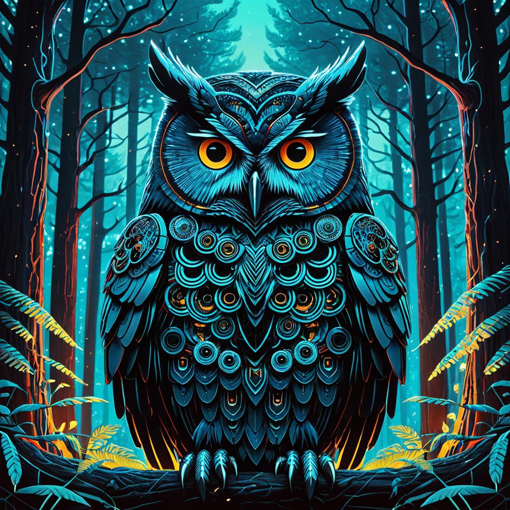 Symmetry!! portrait of a bioluminescent cybernetic owl set against a neon-lit forest at twilight, featuring intricate metallic filigree and luminous circuitry, digital painting, concept art, ArtStation quality, smooth, sharp focus, illustration by Beeple, Lois van Baarle, Hayao Miyazaki, 8K.