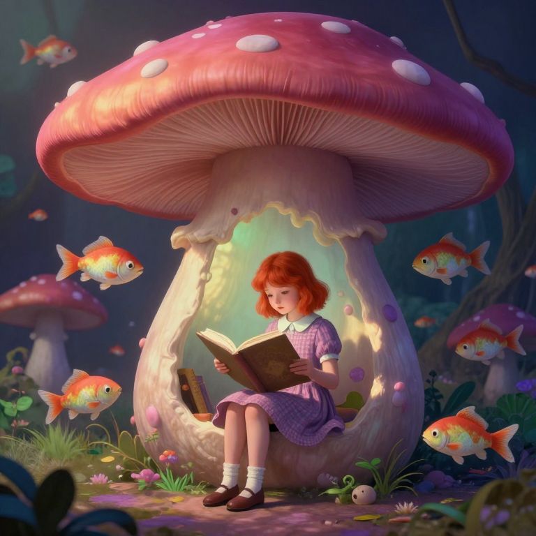 In a surreal library where books transform into luminous mushrooms, the air hums with the whispers of ancient wisdom, inviting introspection amidst the ethereal glow of twilight.