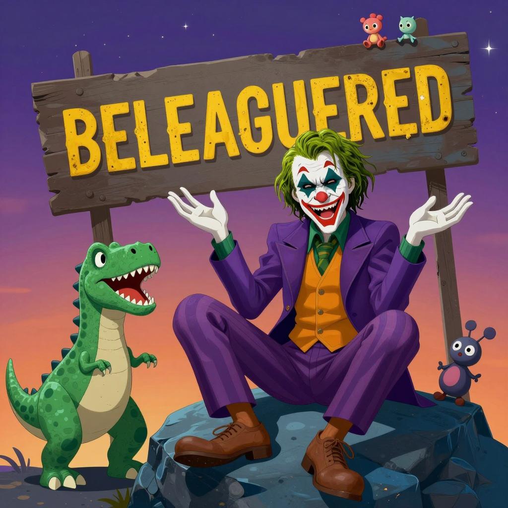 Illustration of the Joker with green hair, wearing a purple and white striped suit, sitting on a blue rock, gesturing with hands open. A sign reads "BELEAGUERED" in yellow letters. A green dinosaur with an open mouth is on the left. Starry purple and orange sky background. Two small creatures near the sign. Joker has a manic expression.