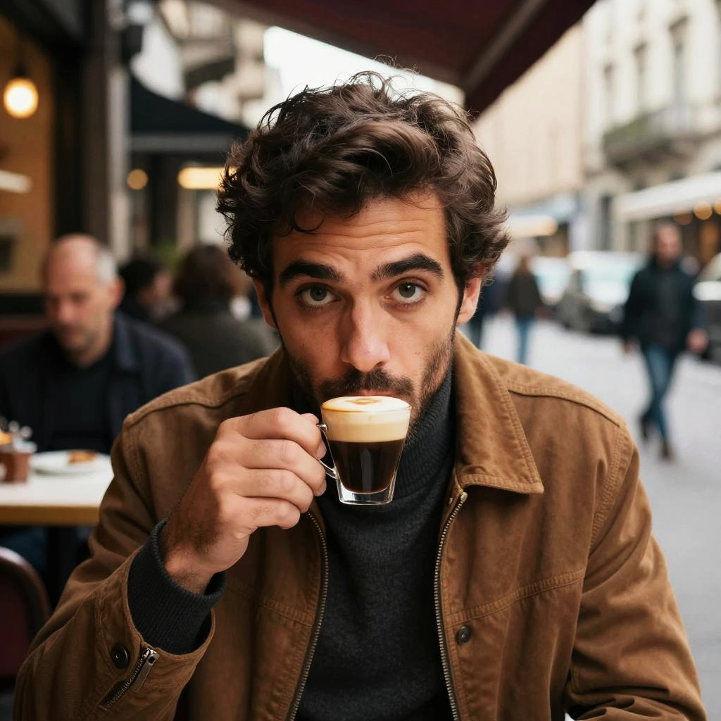 Italian man curly hair, sitting at an outdoor café in Milan, dressed in a tailored suit with a casual vibe, espresso cup in hand, soft golden hour glow