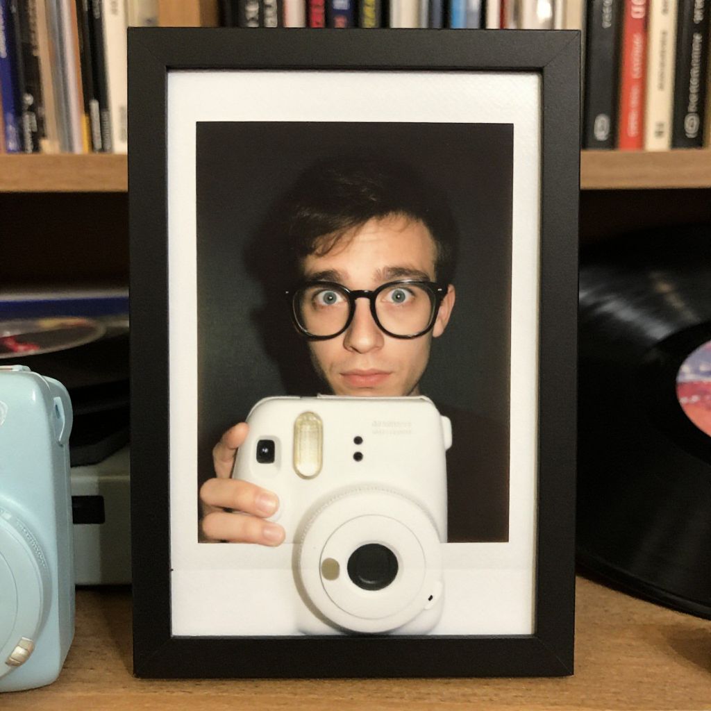 Framed portrait of a bespectacled nerd guy, surrounded by nostalgic electronics, vinyl records, and bookshelves in a dimly lit, intimate setting. Fujifilm Instax Mini 9 instant camera captures the moment, warm tones, soft focus, grainy texture, capturing his curious gaze amidst retro memorabilia. Man has masculine face and piercing eyes