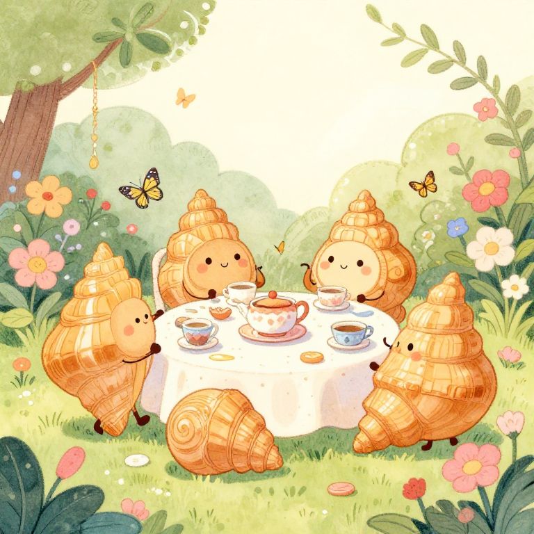 Concha, a whimsical illustration of anthropomorphic conchas having a tea party in a lush garden filled with blooming flowers and delicate butterflies, pastel color palette, charming and playful mood, detailed hand-drawn style.