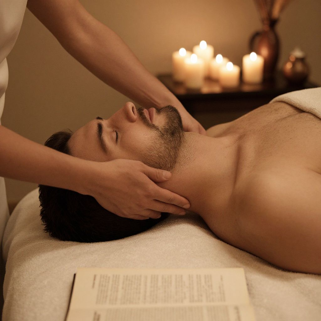 A warm, sepia-toned photograph of a bearded man lying on a massage table with his eyes closed. A person with a slender arm and hand gently massages his neck. In the background, a lit candle arrangement adds a cozy glow. The man is shirtless, and an open book lies in the foreground. The ambiance is relaxing and intimate.