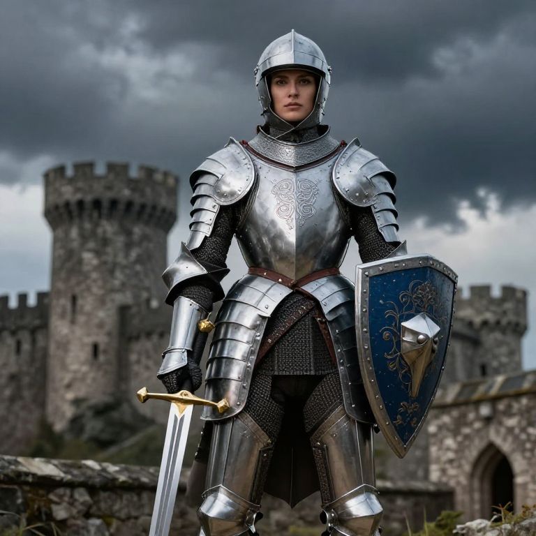 Knight armor female, intricately detailed silver plate armor shining under a stormy sky, standing tall with a sword and shield, medieval castle in background, dramatic lighting