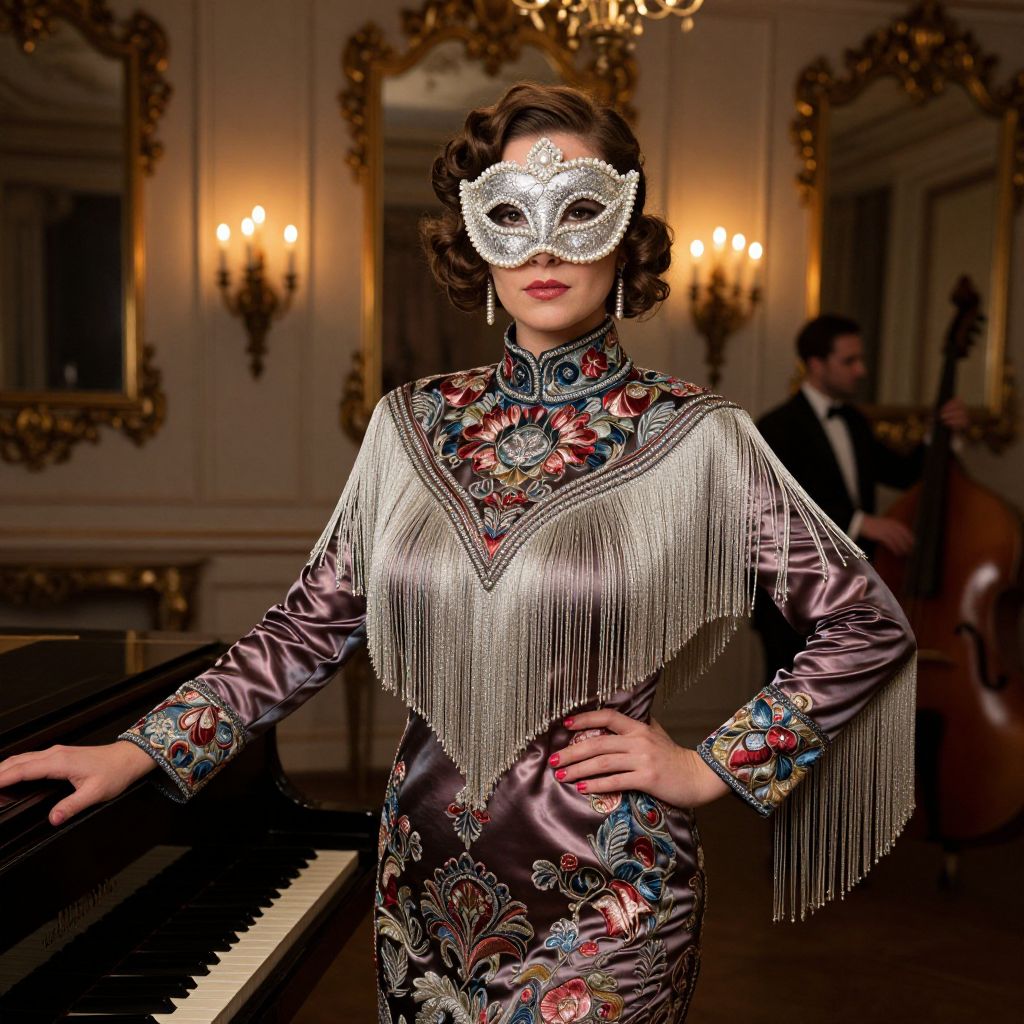 A poised woman dressed in a rich, embroidered silk costume with high collar and cascading silver fringe stands confidently beside a grand piano in an ornate ballroom. She wears a delicate silver and pearl mask covering her face, with vintage curls and red lipstick. The background features antique mirrors, warm candlelight sconces, and a musician playing a double bass, evoking a 1930s high-society masked ball atmosphere.