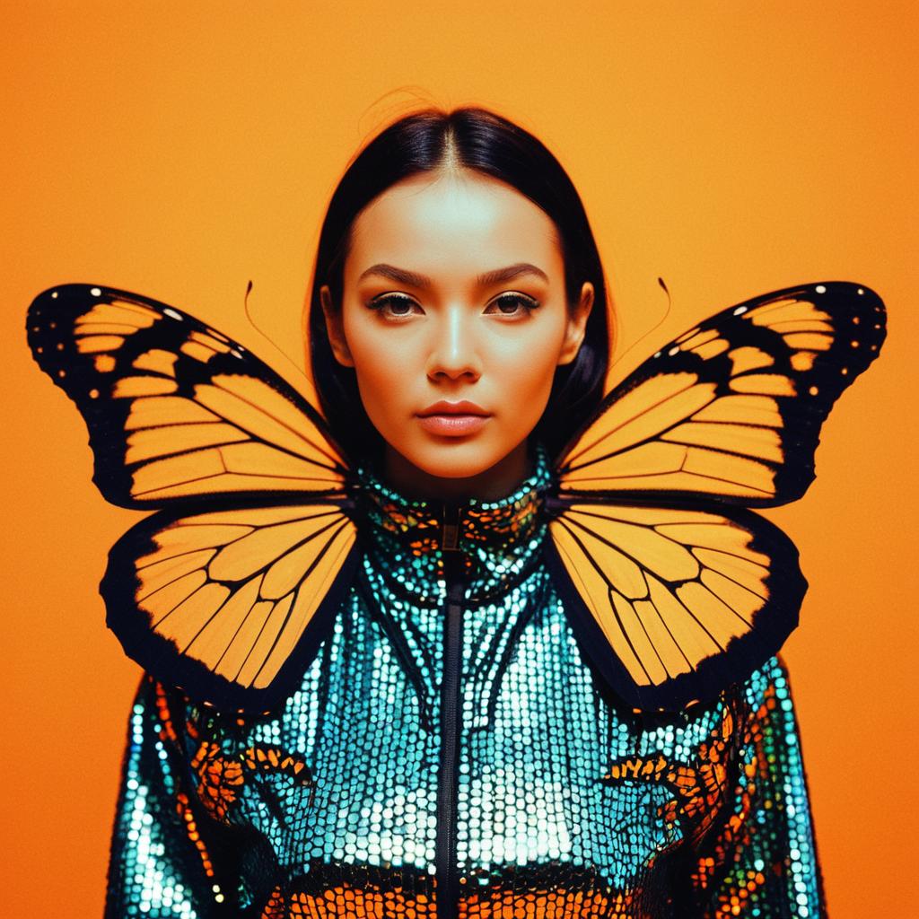 Surreal portrait of a biomechanical tiger-person hybrid against a deep purple background, wearing a sleek armored suit with textural details. Warm, inviting atmosphere achieved with Portra 800 film aesthetics
