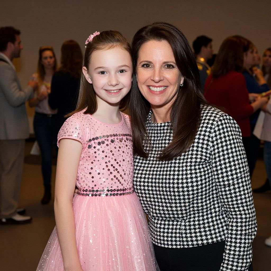 Photograph of a smiling woman with long dark brown hair and a young girl with light brown hair, wearing a pink dress with sparkly embellishments and a pink hair clip. The woman wears a black and white houndstooth pattern top. They stand close together in a dimly lit room with a blurred background of people dressed in formal or semi-formal attire. The woman's skin is fair, and the girl's skin is also fair. The image has a warm, celebratory ambiance.