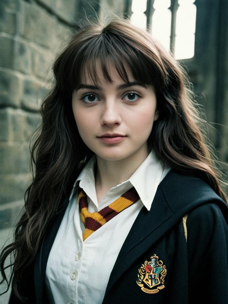 Woman in Harry Potter costume, cosplay editorial portrait, photorealistic style
