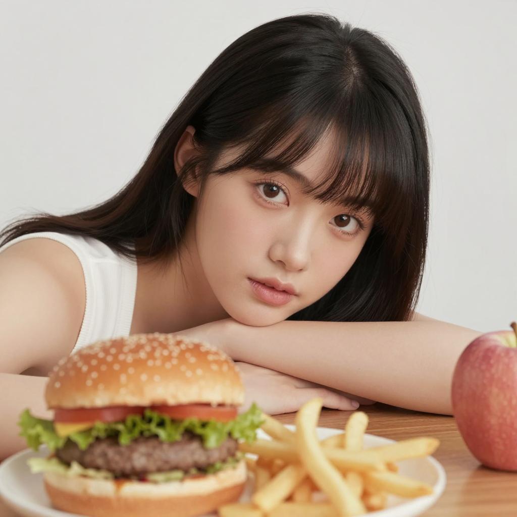 Portrait of an Asian woman with fair skin, straight black hair, and bangs leaning on a wooden table. She is wearing a white sleeveless top and gazing directly at the camera with focused brown eyes. In the foreground, there is a large hamburger with lettuce, tomato, and cheese accompanied by French fries. Red apples are placed in the background on the right side of the frame. The setting is minimal with a plain light background.