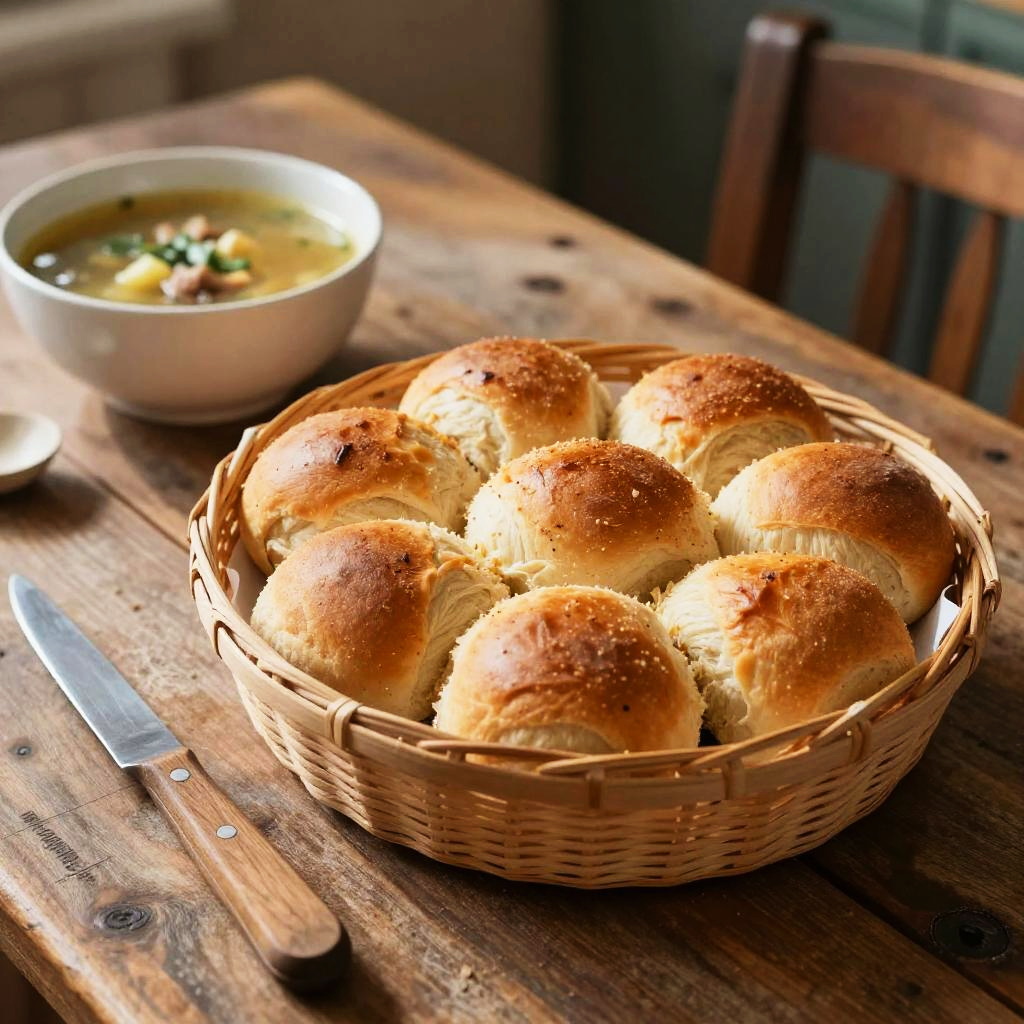 A basket of freshly baked stoties bread rolls on a rustic farmhouse table, accompanied by a bowl of hearty soup and a simple wooden knife, set in a farmhouse kitchen with natural sunlight casting soft shadows.