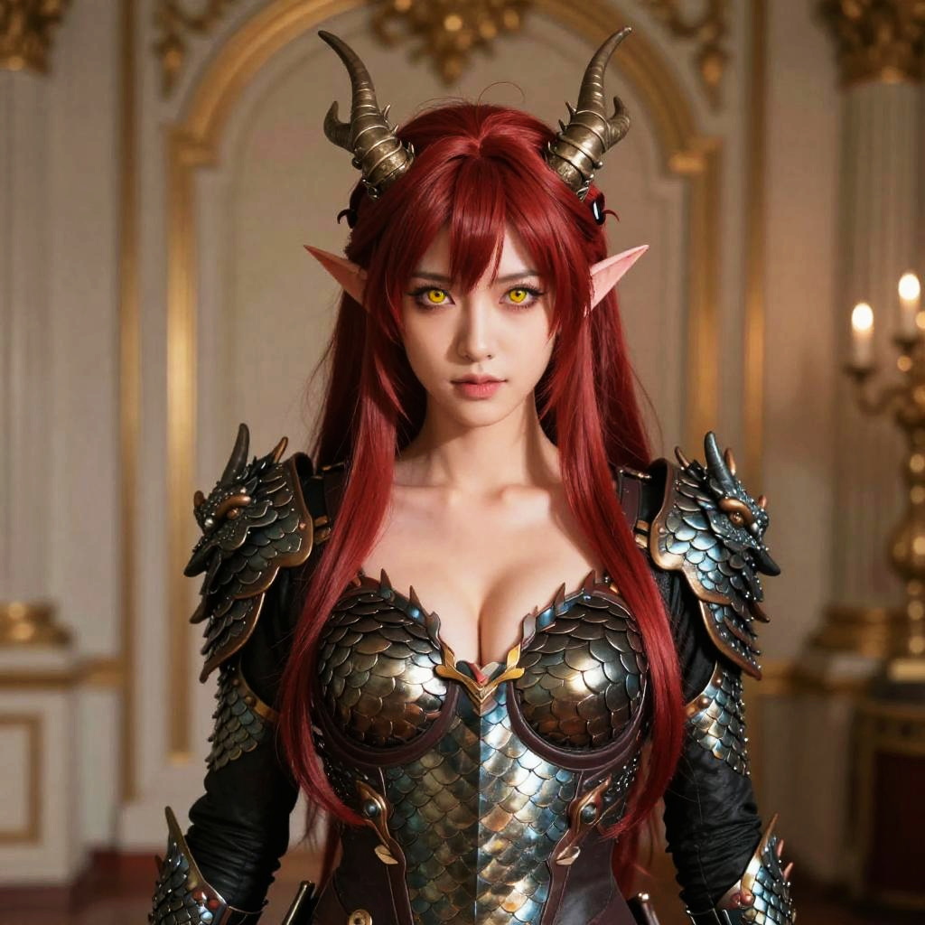 (8k, RAW photo, best quality, masterpiece:1.2), (realistic:1.3), (photorealistic:1.3), ultra-detailed, (high detailed skin:1.2), 8k uhd, dslr, soft lighting, high quality, film grain, Fujifilm XT3, beautiful lighting, 1girl, dragon horns, long hair, twintails, (red hair), messy hair, yellow eyes, tight dragon scale armor, medium breasts, pointy ears, black gloves, smug, standing, royal room
