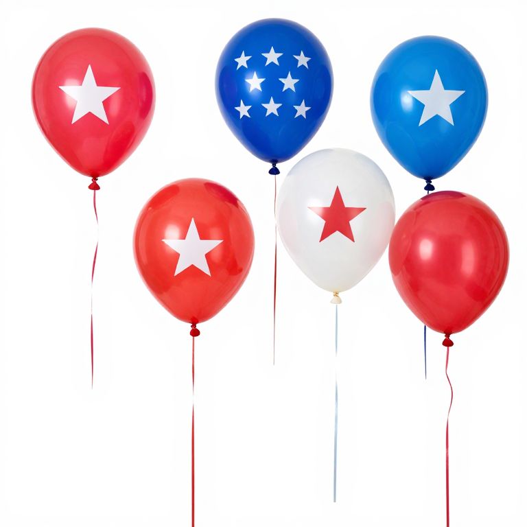 Colorful balloons featuring patriotic designs float gracefully against a white background, symbolizing the festive spirit of the 4th of July.