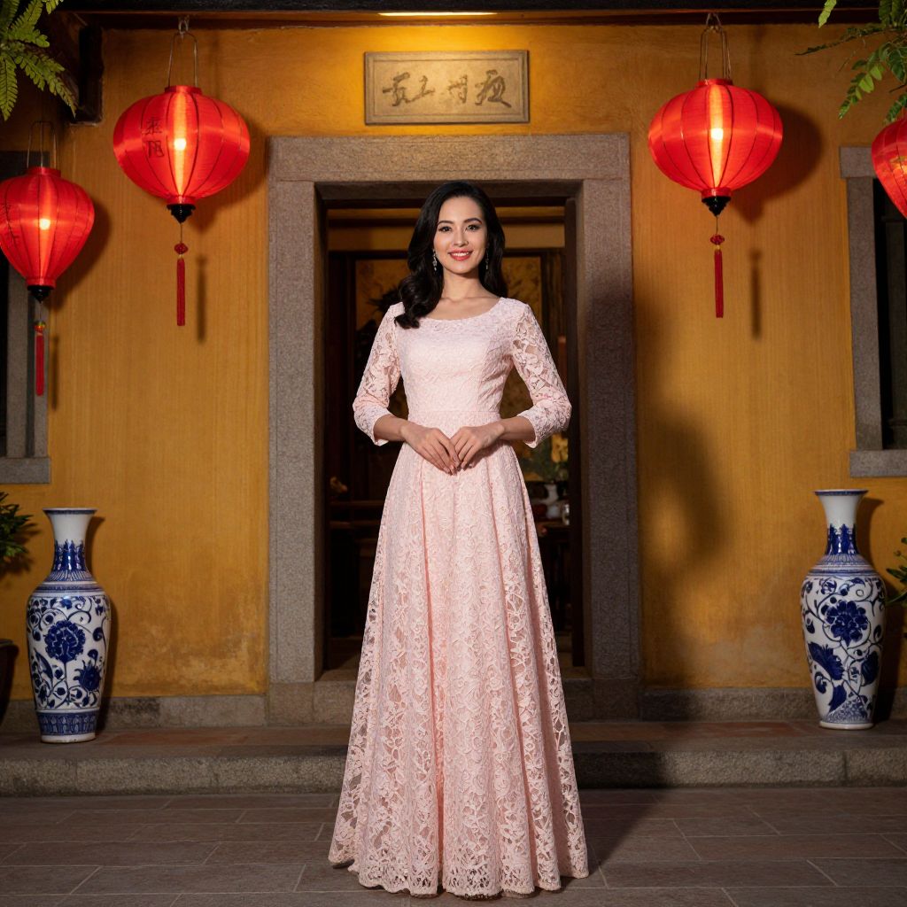 Elegant woman wearing a flowing pink lace dress stands gracefully in a warmly lit Hoi An setting, surrounded by traditional stone walls, hanging red lanterns, and decorative vases.