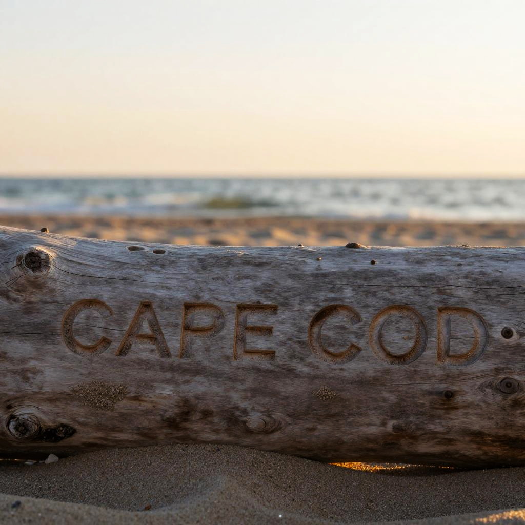 Close-up of Cape Cod font etched into weathered driftwood, with subtle sea spray and sandy textures, evoking a serene beachside atmosphere under golden sunset hues