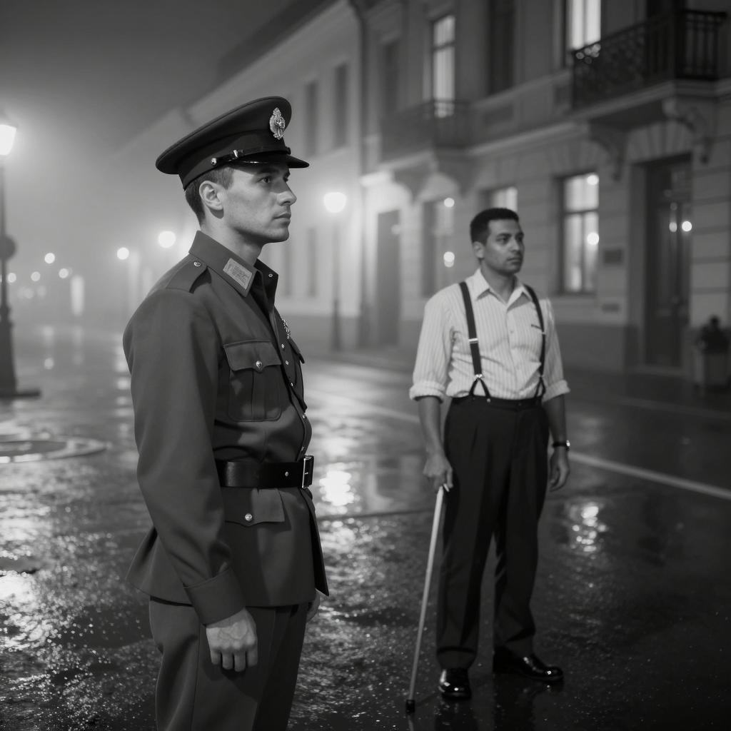 Black and white photograph depicting a tense confrontation between two men. The man on the right is wearing a Nazi SS uniform with distinct insignia and a peaked cap, pointing a pistol directly at the man on the left. The man on the left is dressed in a white shirt with suspenders and dark trousers, standing calmly. The setting includes a stone wall, a window, and a patterned carpet on a table with a hat placed on top.