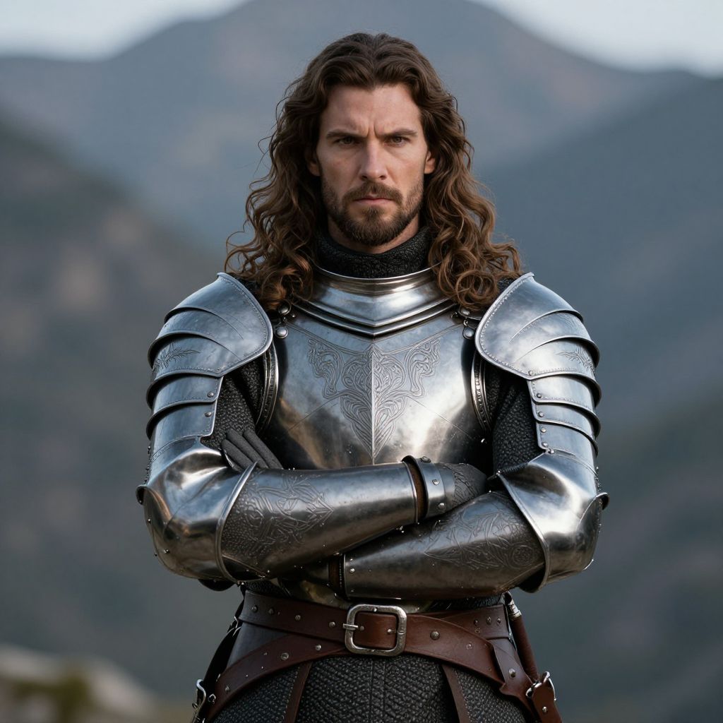This is a photo of a serious-looking man with long, wavy brown hair and a beard. He's wearing detailed, shiny medieval armor with intricate engravings on the chest plate, and a dark, textured underlayer. His arms are crossed, and he's standing against a blurred mountainous background. The armor has a brown leather belt with a metallic buckle. The lighting highlights the armor's reflective surface.