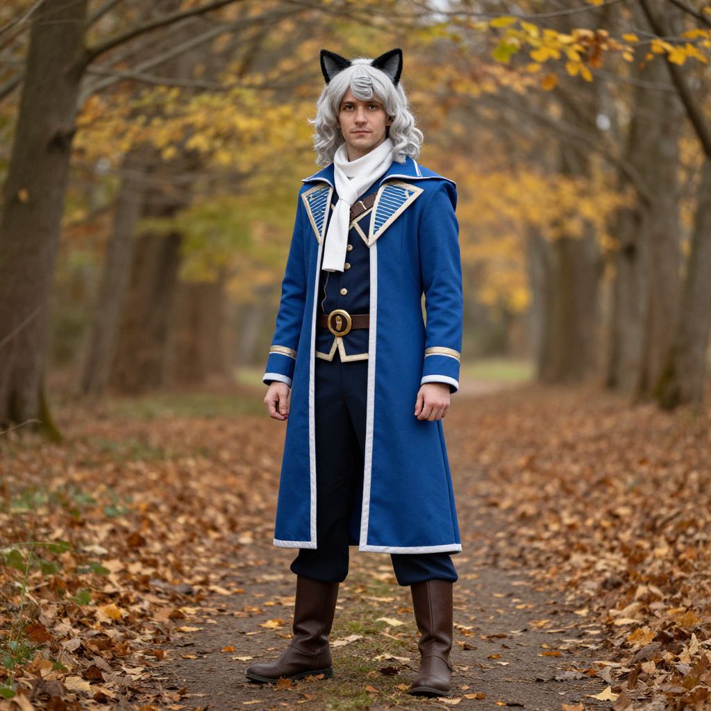 Photograph of a man standing in a forest pathway covered with fallen autumn leaves. He has white, wavy hair and wears black cat ears. His outfit includes a blue, long coat with white trim, black pants with a white belt and gold buckle, brown boots, and a white scarf. The background features trees with yellow and orange leaves, creating a warm, seasonal atmosphere. The man's expression is neutral, and he stands confidently in the center of the image. The pathway is slightly muddy, adding texture to the scene.