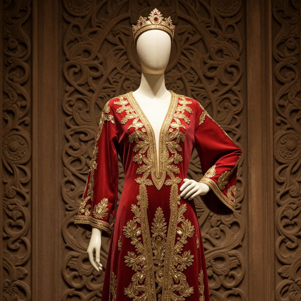 A mannequin wearing a red dress with gold embroidery and a crown on his head, standing in front of a carved wall with intricate designs. The mannequin has a strong, statuesque figure with a confident posture, emphasizing the elegance and grandeur of the scene. The red dress is adorned with detailed gold embroidery, adding a touch of luxury and opulence. The carved wall features intricate patterns and motifs, suggesting a rich cultural or historical significance. The overall atmosphere is one of sophistication and mystery, with the mannequin exuding a sense of authority and timeless beauty.