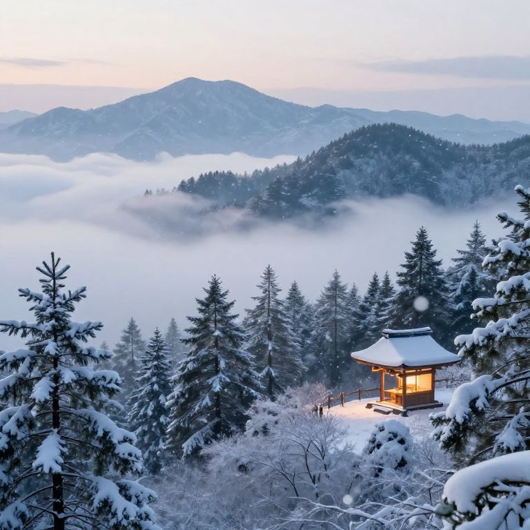 Japanese background gif illustrating a misty mountain landscape with layered pine forests covered in snow, clouds drifting quietly between peaks, a small wooden shrine glowing warmly at dawn, and animated falling snowflakes adding a peaceful, serene atmosphere.