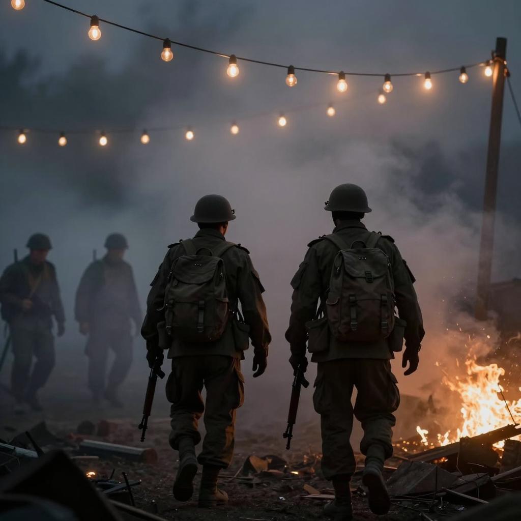 Three male soldiers stand in a war-torn forest. Each holds a rifle upright. The left soldier has short brown hair, stern expression, black vest, and green helmet. The center soldier has dark hair, neutral expression, dark shirt, no vest, green helmet. The right soldier has short brown hair, intense expression, green vest, green helmet. Background includes smoke, burning structures, and greenery.