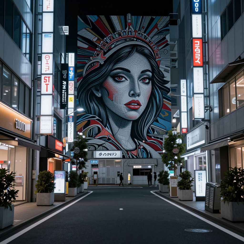 A futuristic, empty Tokyo street at night, illuminated by neon lights and adorned with a large, intricate mural of a woman's face.