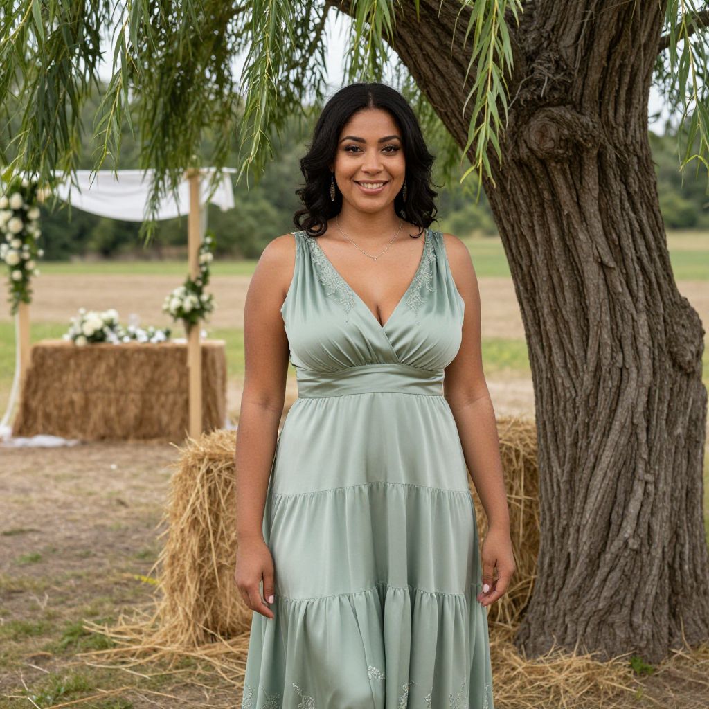 A natural lighting outdoor scene of a woman with medium brown skin, kind eyes, and a warm smile, wearing a sage silk bridemaid dress with a flowing tiered silhouette and subtle embroidery, posing under a large willow tree during a rustic countryside wedding celebration with hay bales and floral decorations in the background.. The woman has big tits and cute face