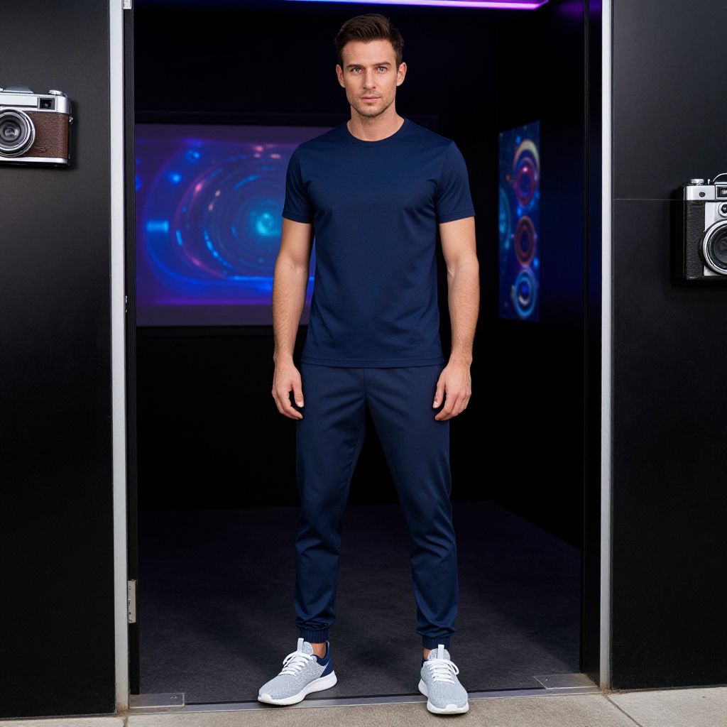 A man, short-sleeve polo shirt, tailored athletic shorts, navy blue with subtle patterns, durable court shoes, rustic stone tower, crashing waves below, dramatic sunset sky, lithographic film style, relaxed smile, confident demeanor. Man has masculine face and piercing eyes