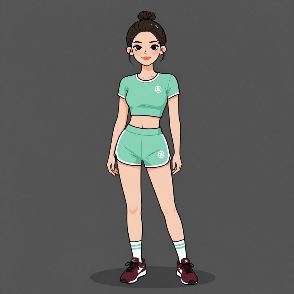 Digital drawing of a young woman with light skin and dark hair in a high bun. She wears a mint-green crop top and high-waisted shorts with white logos on the chest and left leg. She has white socks and maroon sneakers with white soles. Her expression is neutral, and she stands against a solid dark gray background. The art style is clean and cartoonish, with simple, bold lines and flat colors.