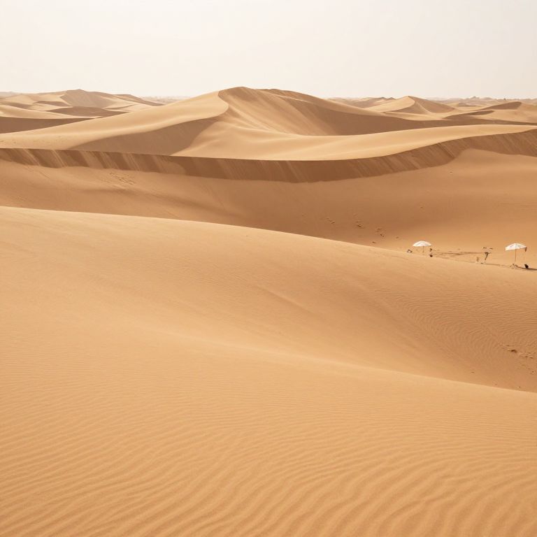 Photograph of a vast, sunlit desert with rippled sand dunes, warm orange tones, and two small figures walking in the distance.