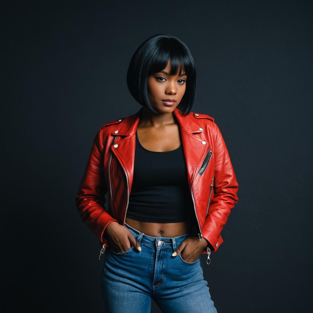 Portrait of a confident young Black woman wearing a red leather jacket, black tank top, and high-waisted blue jeans. She has a short black bob hairstyle with bangs and simple makeup. The background is a solid dark color, highlighting her style inspired by 1990s casual chic fashion.