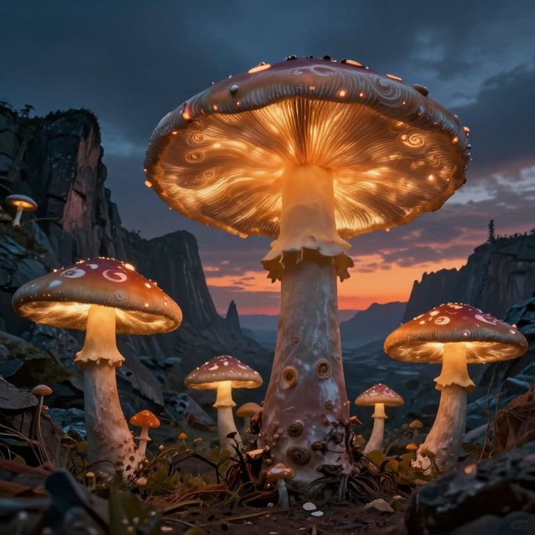 The image depicts an otherworldly landscape dominated by towering, surreal mushrooms with intricate, swirling patterns on their caps. These mushrooms, varying in size and shape, rise from the ground, their caps glowing with an ethereal, warm light. The background features a dramatic, rocky terrain with jagged cliffs and a distant, hazy horizon. The sky is a mix of deep blues and oranges, creating a striking contrast with the mushrooms. The overall composition is dynamic, with the mushrooms and rocky formations creating a sense of depth and movement. The scene is both fantastical and otherworldly, evoking a sense of wonder and mystery.