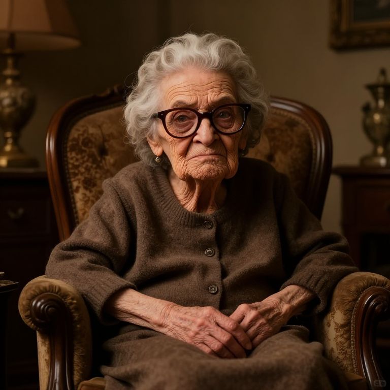 Photograph of elderly woman with curly white hair, glasses, brown cardigan, sitting in ornate armchair, hands clasped, dimly lit