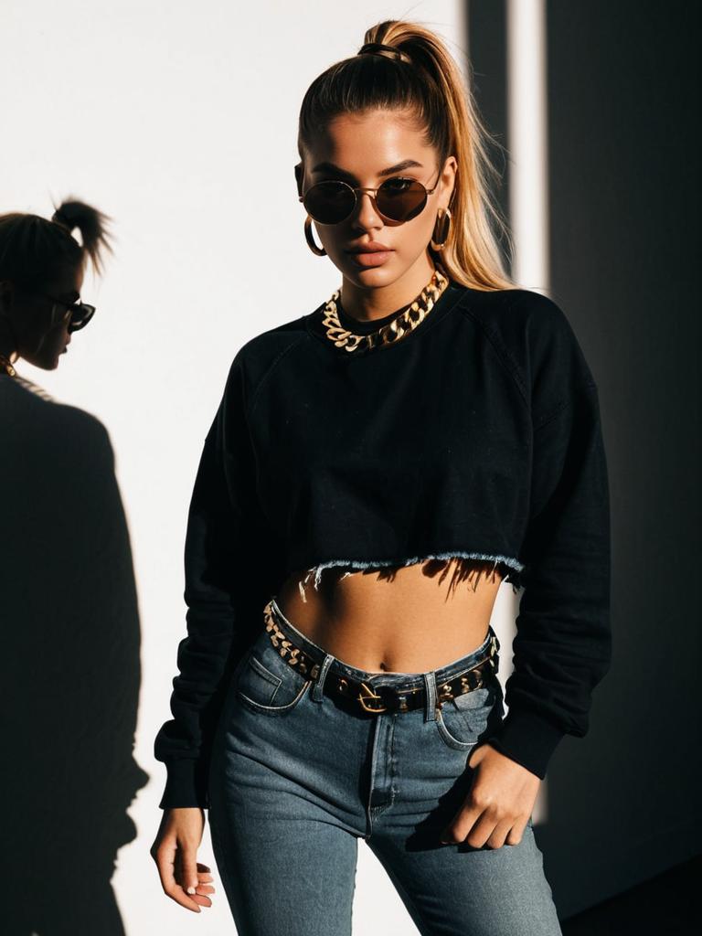 Woman, contemporary streetwear, leopard print one-sleeve crop top with asymmetrical neckline, single long sleeve, dark denim jeans with high waist, cut-out detail above the hip, wide black belt with large silver-toned buckle, minimalist studio background. --sref 1404
