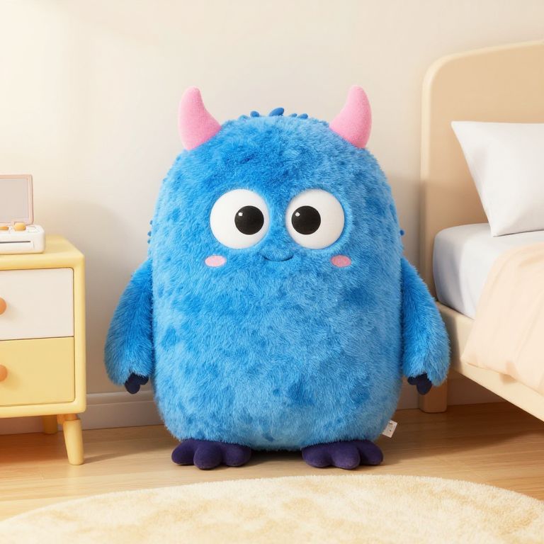 A cute blue kawaii shadow monster plush toy with big round eyes, pink horns, and purple hands and feet. The plush toy is placed on a light wooden floor in a bedroom with retro-style furniture including a yellow nightstand and a beige bed. The setting features soft pastel colors and a cozy, child-friendly atmosphere.