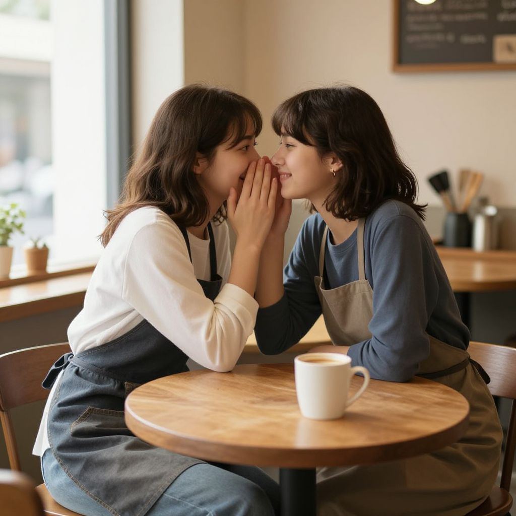 Digital artwork of two young women sitting at a wooden café table, engaged in an intimate moment with one whispering to the other. Both wear aprons and casual long-sleeve shirts. The scene is warmly lit by natural light from a window, highlighting a cozy and inviting interior with mugs of hot coffee and kitchen utensils in the background.
