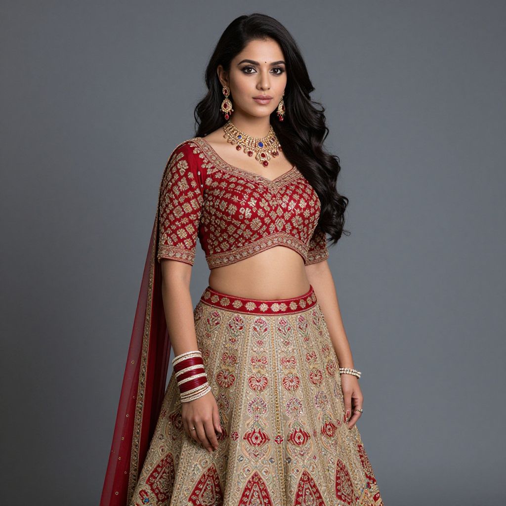 Photograph of a beautiful South Asian woman with long black hair, wearing a red and gold traditional lehenga, crop top, and ornate jewelry,