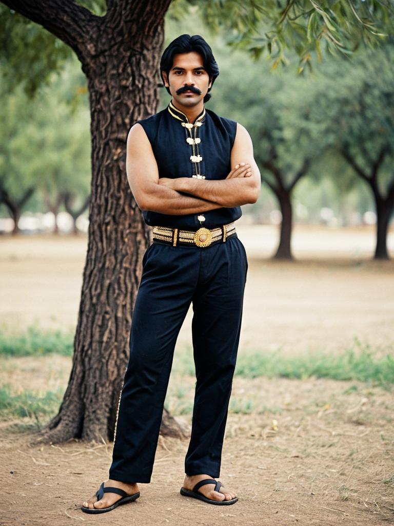 Indian western dance costume, 1boy, male focus, outdoors, facial hair, crossed arms, blurry, black hair, mustache, sandals, tree, pants, solo focus, blurry background, full body, looking at viewer