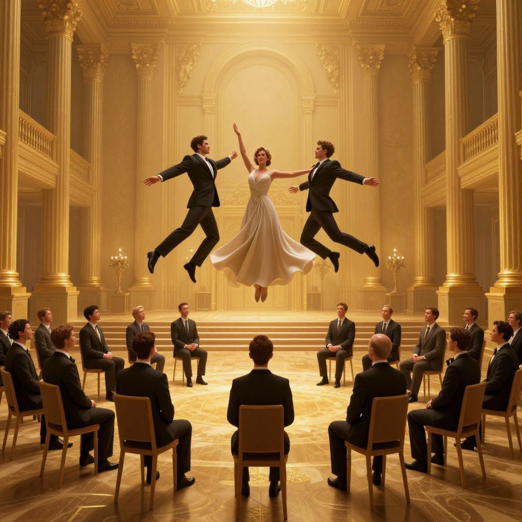 Photograph of a grand, opulent hall with golden, ornate columns and chandeliers. At the center, a woman in a flowing white gown and two men in black suits are mid-air, performing a synchronized leap. The woman's dress billows dramatically around her. In the foreground, twelve men in black suits sit in rows on beige chairs, facing the performers. The warm, golden light creates a dramatic, theatrical atmosphere. The image exudes elegance and dynamic movement, blending classical architecture with modern dance.