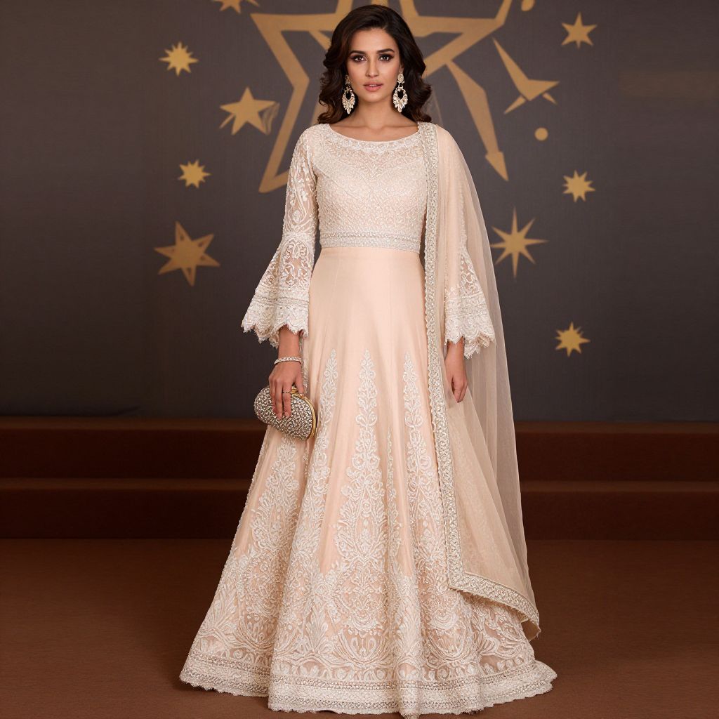 Elegantly dressed woman showcasing a stunning Pakistani wedding gown featuring intricate lace detailing, flared bell sleeves, and a flowing peach skirt, complemented by a sparkling clutch and statement earrings against a decorative star-patterned backdrop.