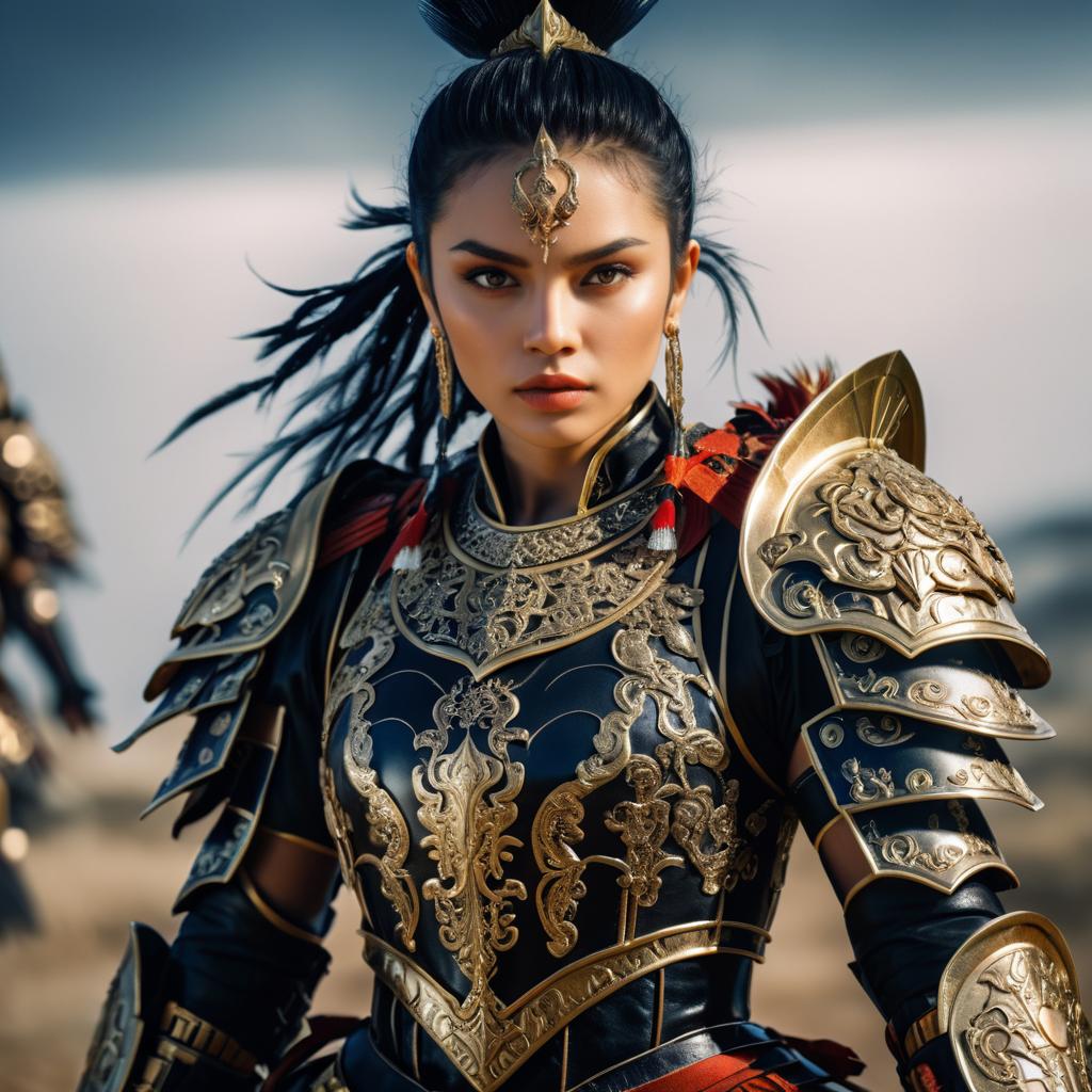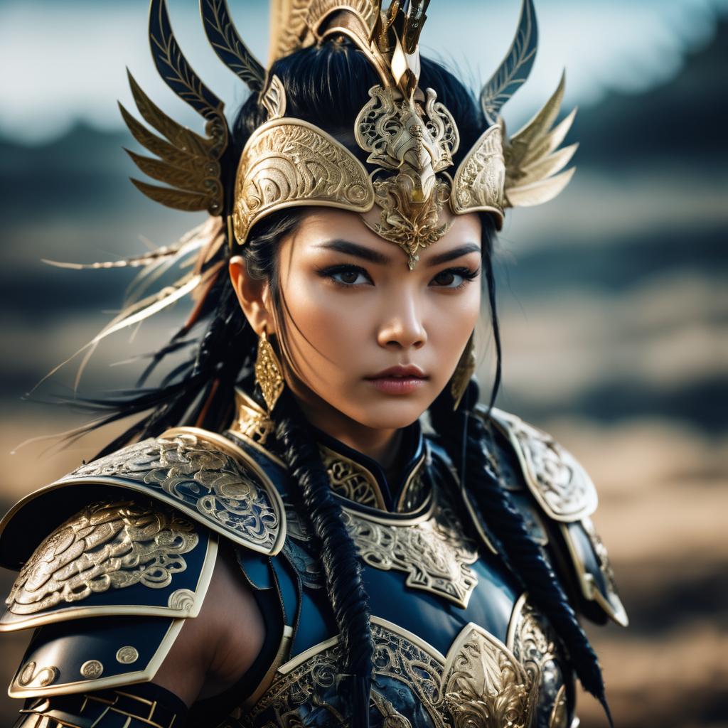 Portrait of an Asian female warrior wearing elaborate gold and black armor with intricate engravings. She features a fierce expression and a detailed golden headdress with wing motifs, styled with braided hair and matching armor design. The image is captured outdoors on a blurred battleground background, emphasizing a cinematic and high-detail fashion photography style inspired by Yoshitaka Amano.
