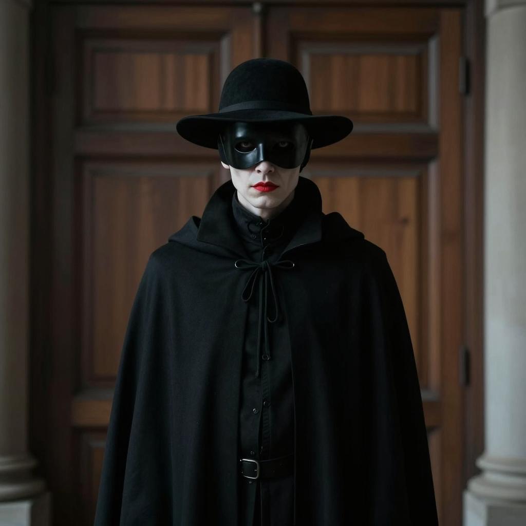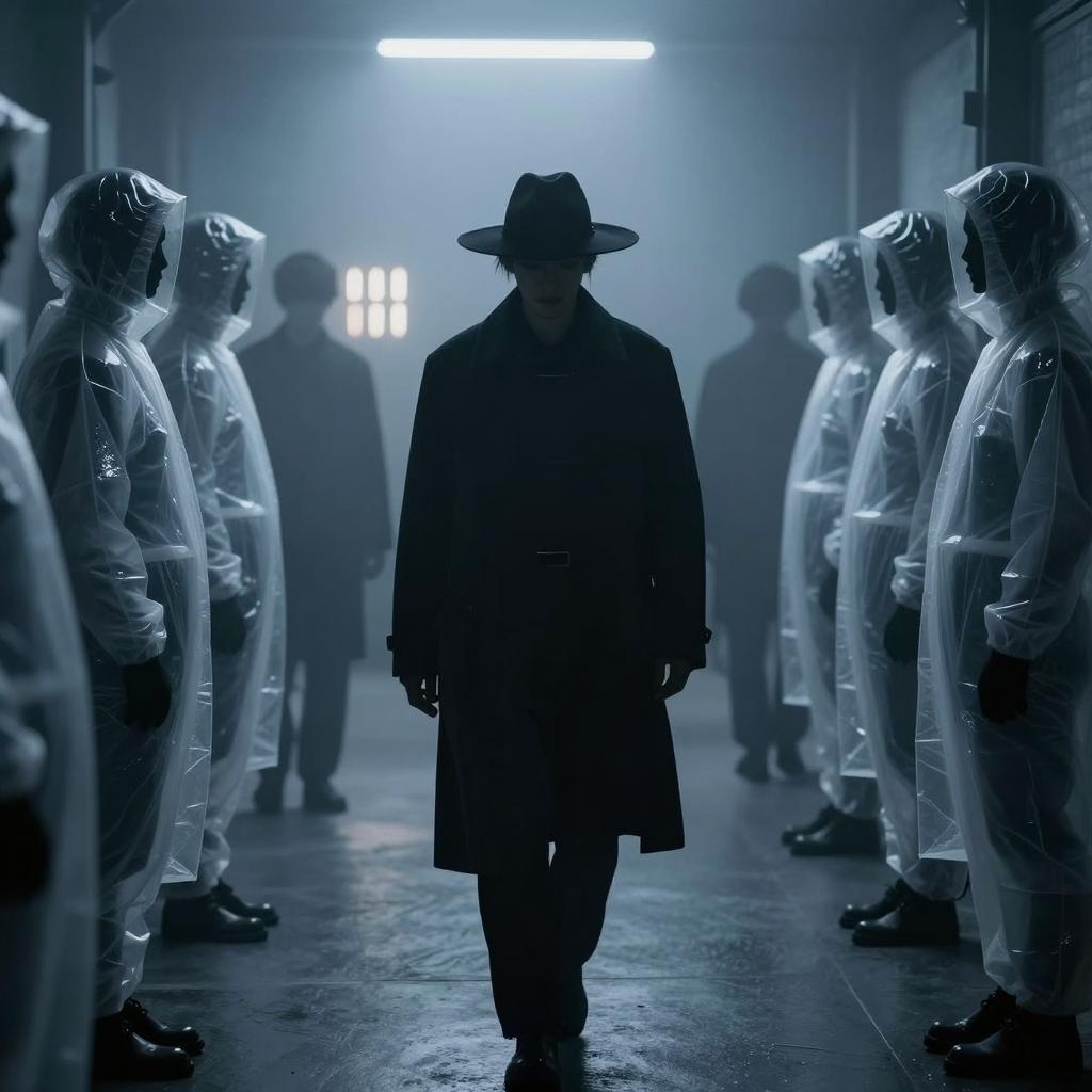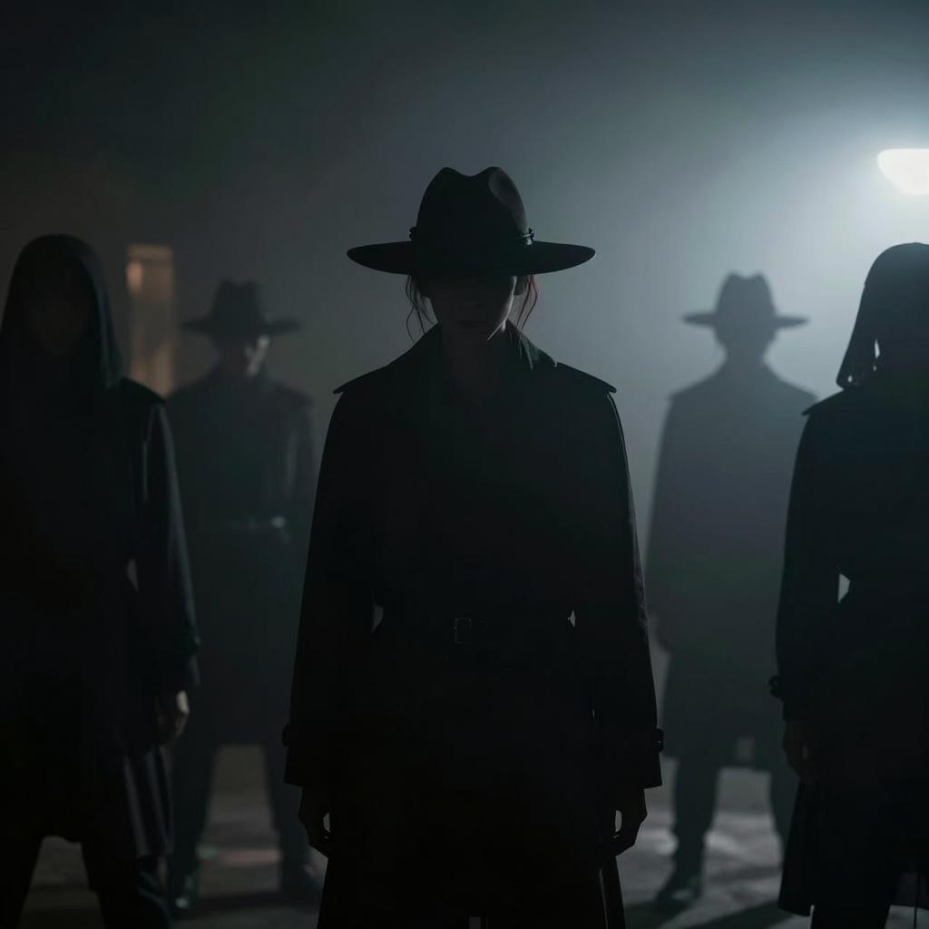Silhouetted figure in a wide-brimmed hat stands in a dimly lit, foggy room. Four other shadowy figures are on either side, partially visible. Background includes indistinct shapes and a bright light source on the right.