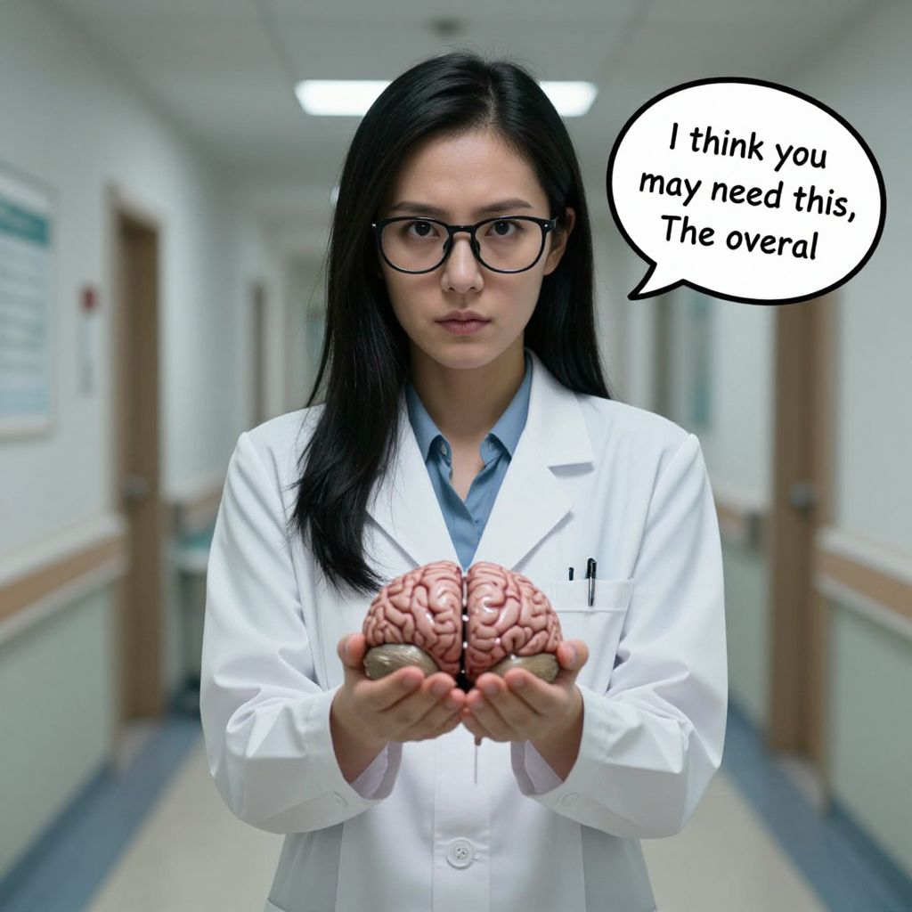Photograph of an Asian woman with black hair, glasses, and white lab coat holding a realistic brain model, saying, "I think you may need