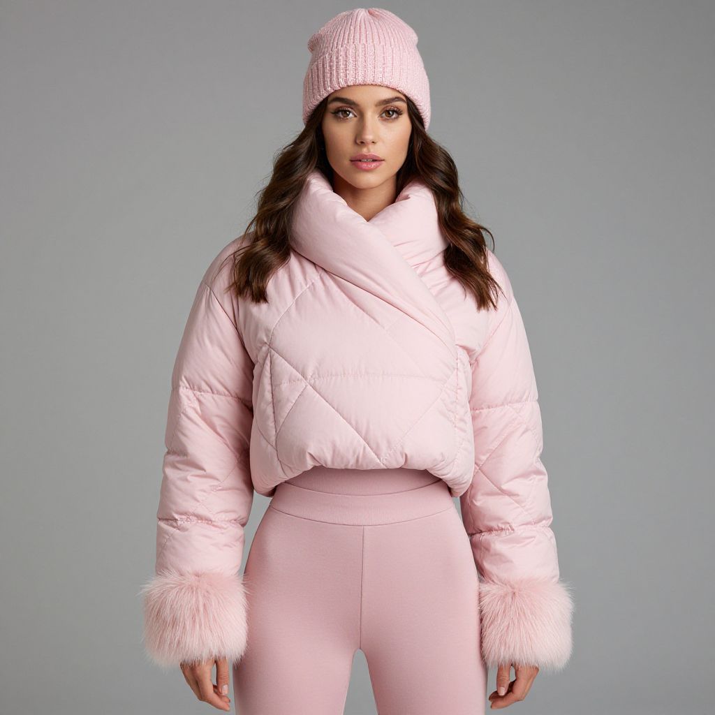 "Woman, winter chic, pastel pink puffer jacket with high wrap-around collar, diamond stitching, cropped length, faux fur cuffs, matching pink slim-fit trousers, ribbed knit beanie, photo studio background. Sexy. Pretty face and beаutiful eyes. Big breasts."