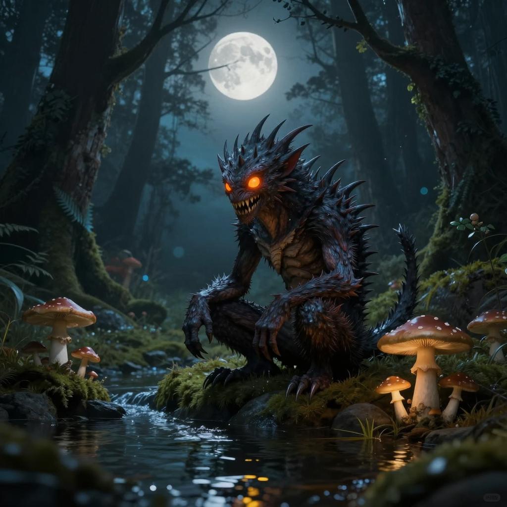 A fantasy creature with glowing orange eyes and sharp teeth crouches by a reflective water stream in a dark mystical forest. It has a spiky body adorned with mushrooms, surrounded by moss-covered rocks and various mushrooms growing nearby. The scene is illuminated by a glowing full moon in the blue-green atmospheric night, featuring a moody and magical painterly texture.