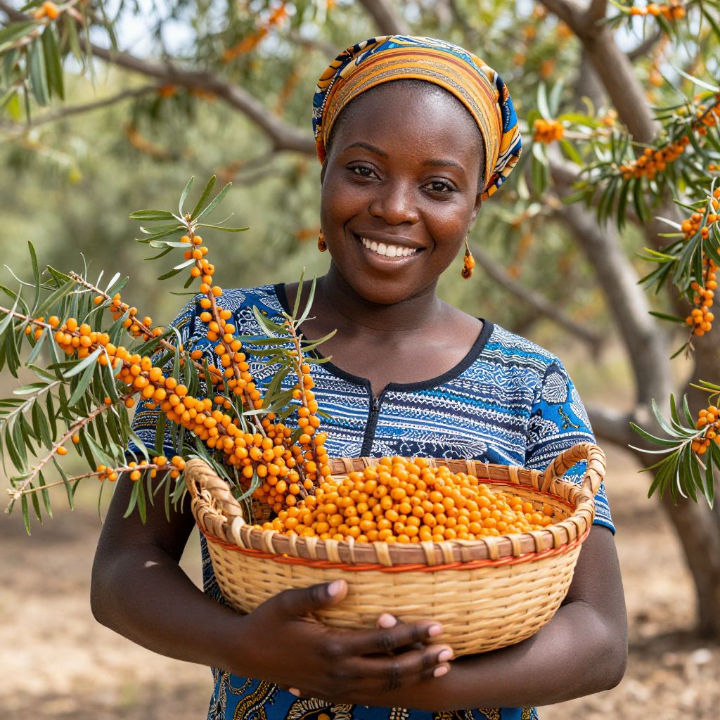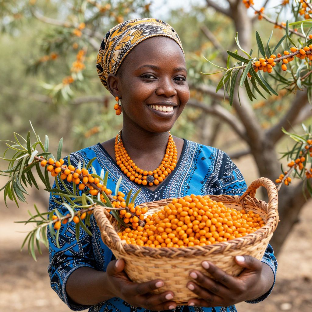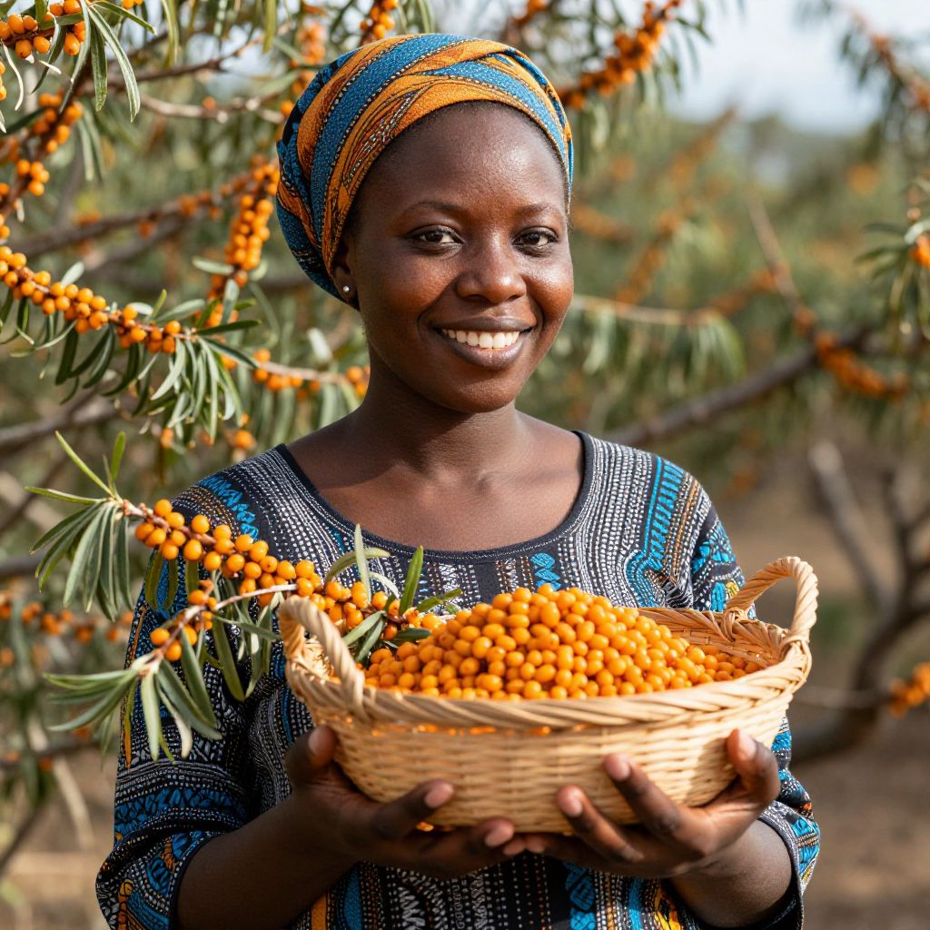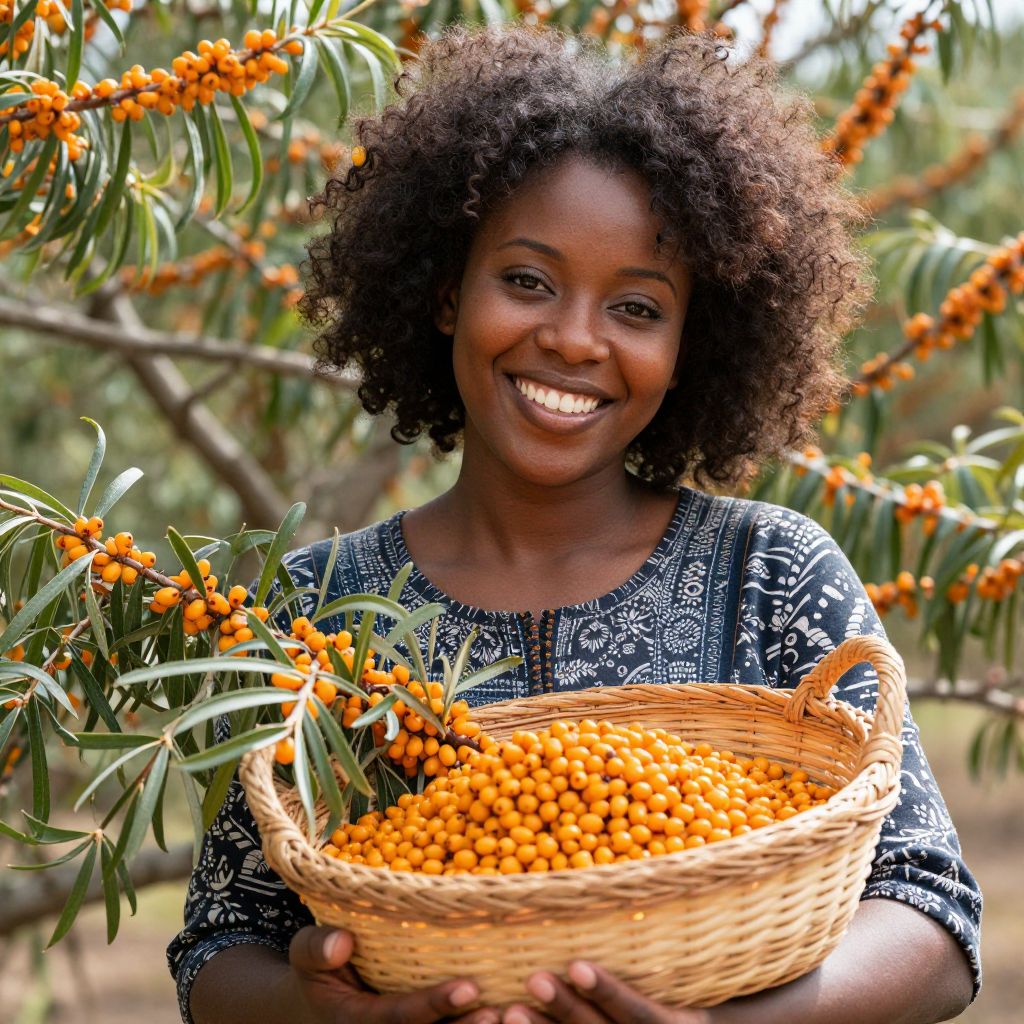 Radiant joy and the warmth of connection bloom as a vibrant African American woman cradles a basket of sea buckthorn berries, embodying the harvest of abundance and the enduring spirit of nature.