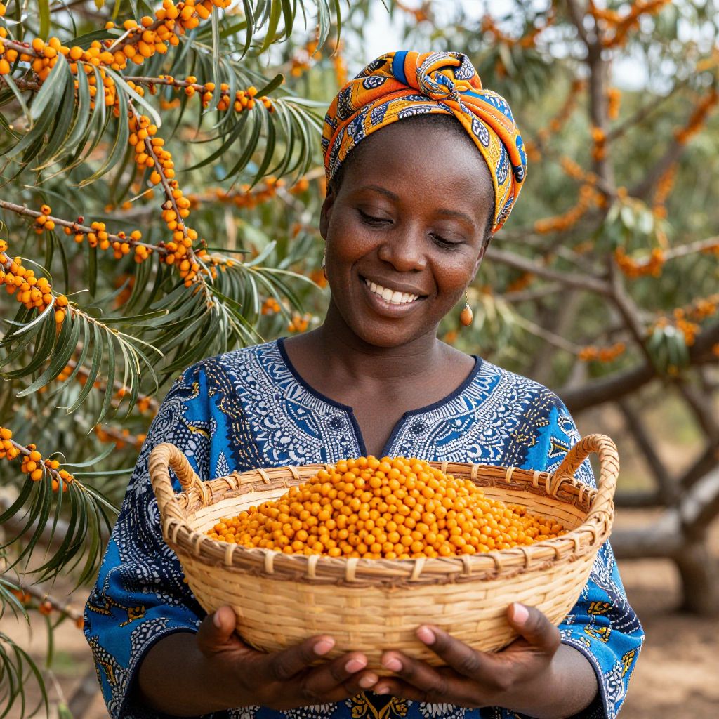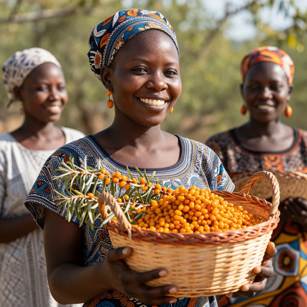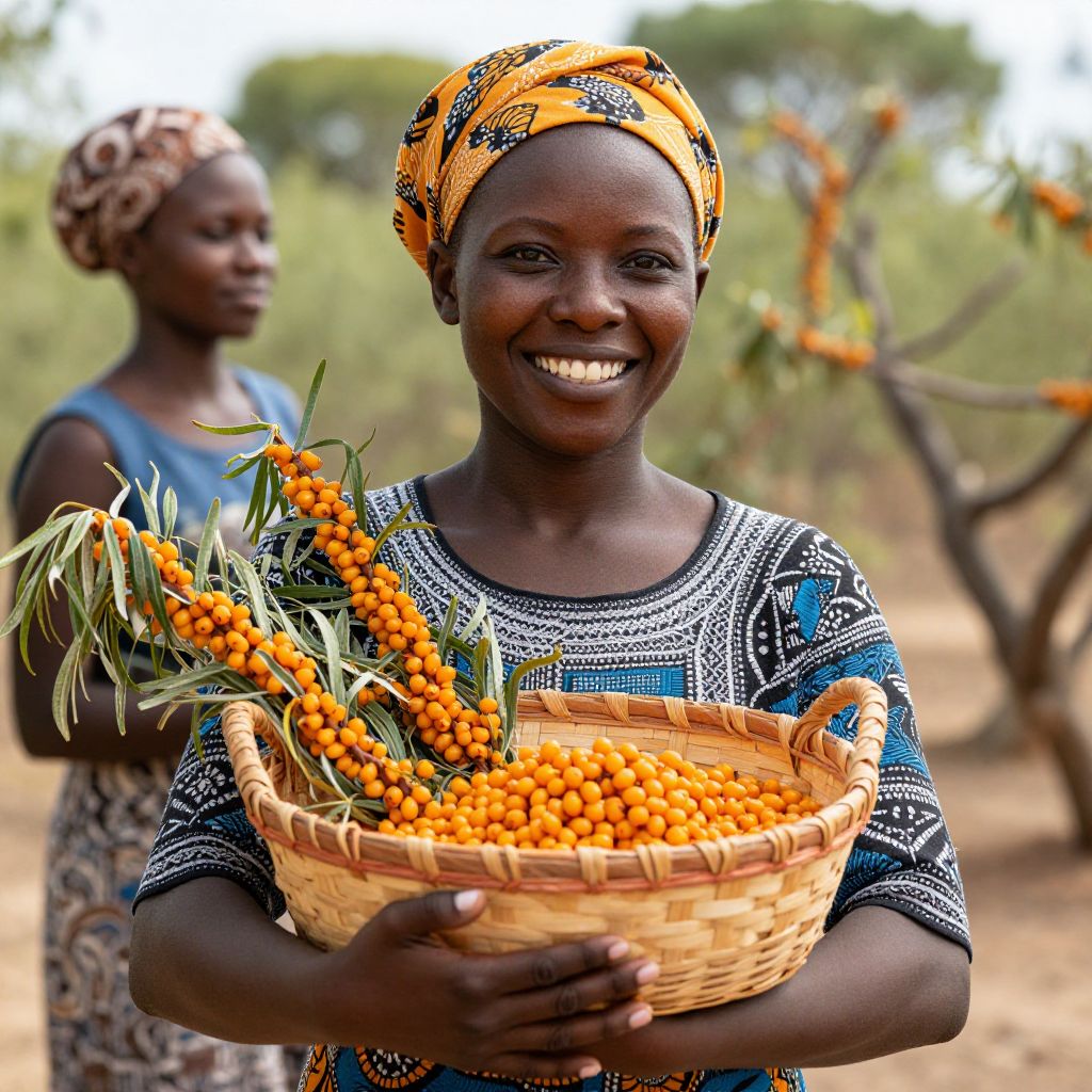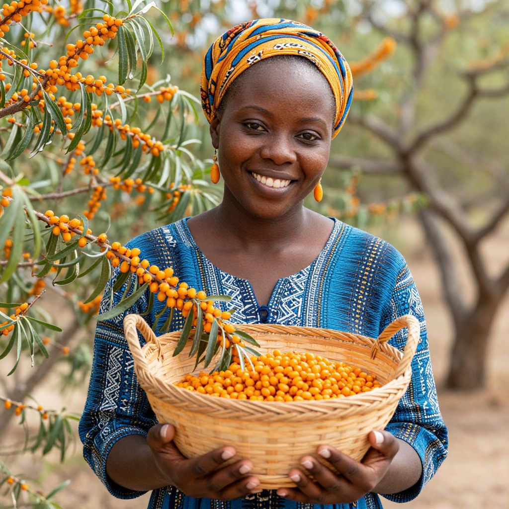 Radiant joy and the warmth of connection bloom as a vibrant African American woman cradles a basket of sea buckthorn berries, embodying the harvest of abundance and the enduring spirit of nature.
