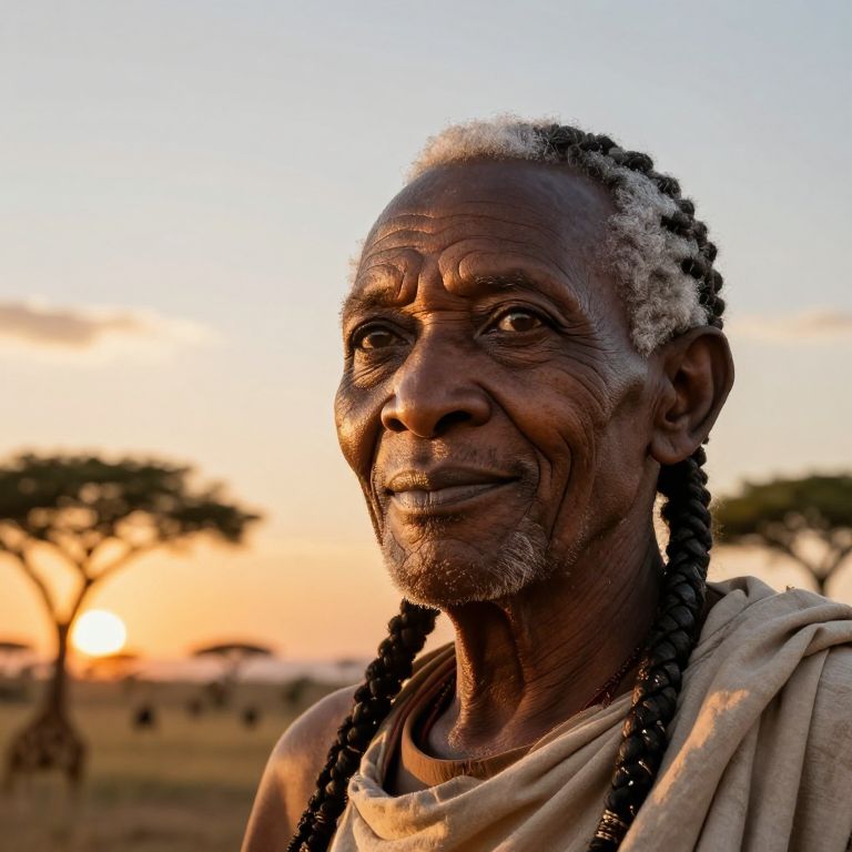 Envision a super-realistic portrait of an African elder with deep brown eyes, their silver hair intricately braided, and a gentle smile reflecting life's lessons. Set against a serene savannah sunset, warm golden light casts long shadows across the subject's weathered face. The unconventional low-angle perspective, akin to that of a curious giraffe peering over treetops, emphasizes the elder's commanding presence while inviting viewers into an exploration of their wisdom and experience. This harmonious blend of photorealistic detail and dreamlike atmosphere creates a captivating image.